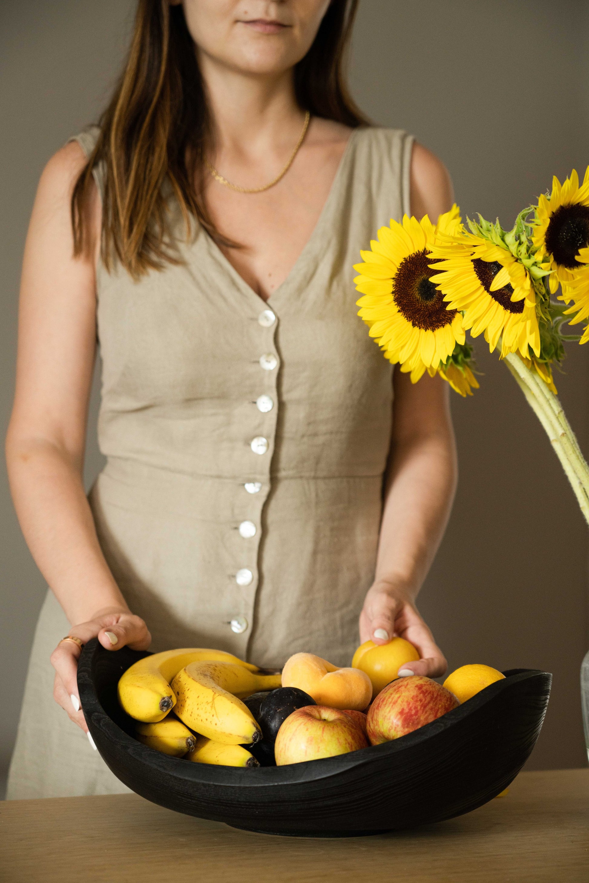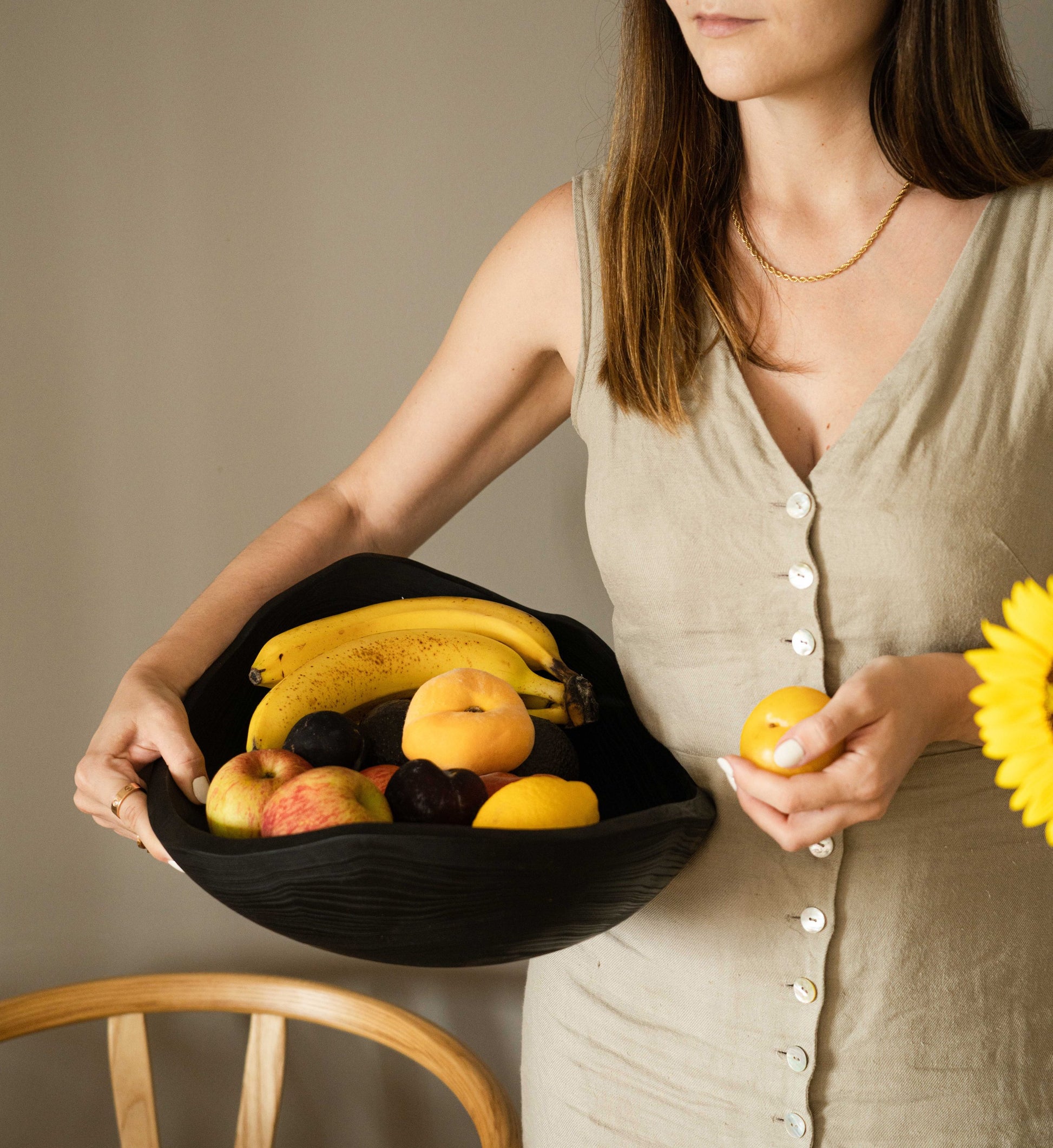 A shallow charred wood bowl will become a centerpiece on your table and a perfect plate for all your fruits or vegetables in the kitchen. Hand-carved from one solid piece of ash wood, charred to add this beautiful opaque black color, and finished with a food-safe oil so you can enjoy this incredible natural creation for many years to come. The ripped edges only add a wabi-sabi look to this piece. Available in 2 variations - tall and low.