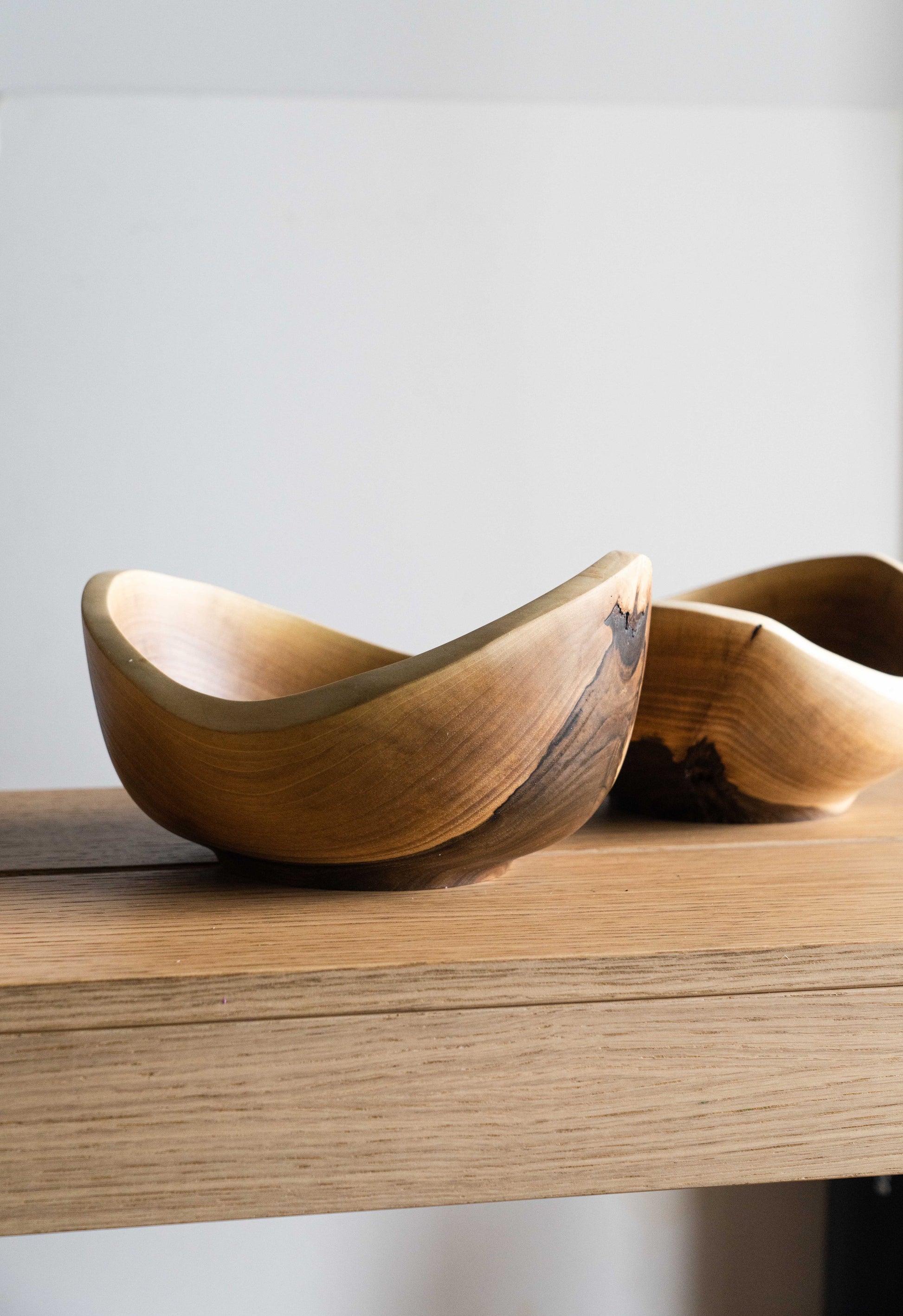 This small wood bowl will become a centerpiece on your table and a perfect vessel to serve bread or snacks on your dinner table. Hand-carved from one solid piece of walnut wood, the shape continues the wooden rings and puts the age and the beauty of the natural material in focus. To perfect the bowl, the wood is sanded and given an oil finish. Due to the characteristics of wood, cracking may occur. Each bowl is unique.