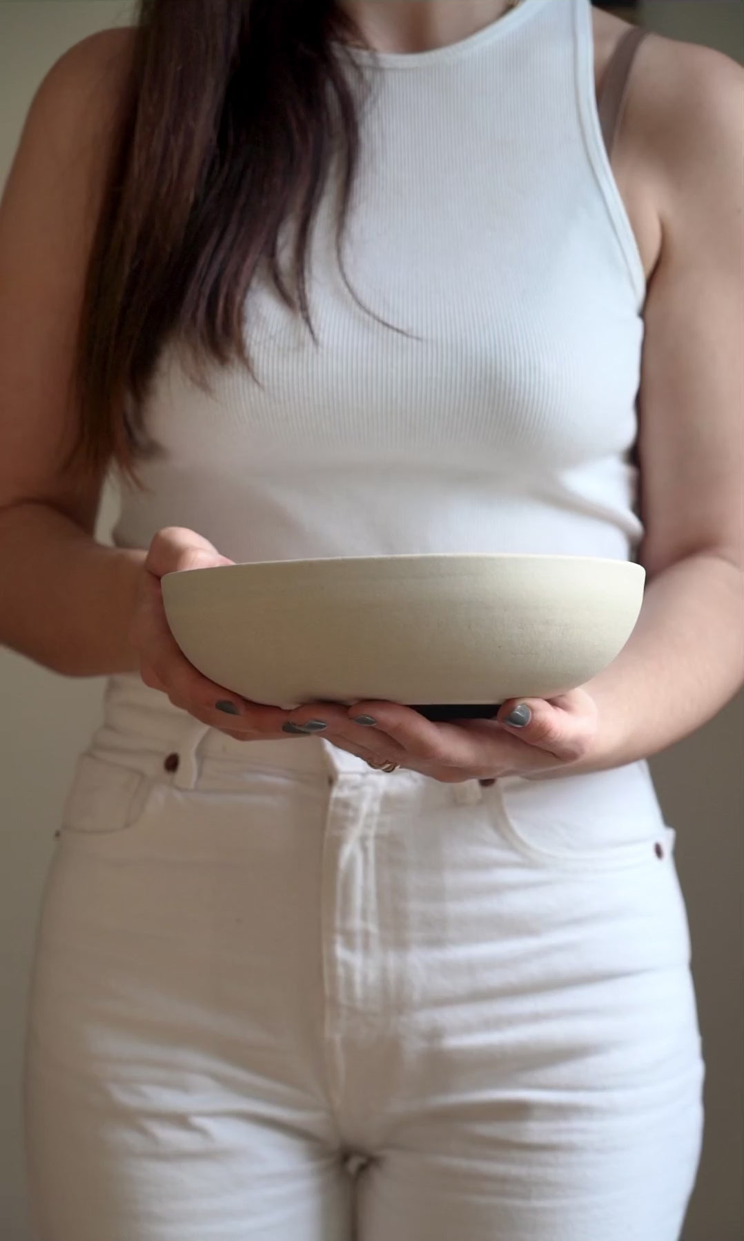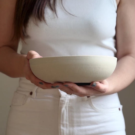 This is the most honest ceramic ware we have ever produced - exposed rough stoneware shows occasional signs of the artisans' fingers that were left during the hand-throwing process. The sides were smoothed but one can still see stoneware pores as if the dinnerware is breathing. The inside is covered with opaque white glaze for convenient use. This pasta bowl is perfect for serving pasta, salads, and main dishes to your table and sharing a wonderful meal with your beloved ones.