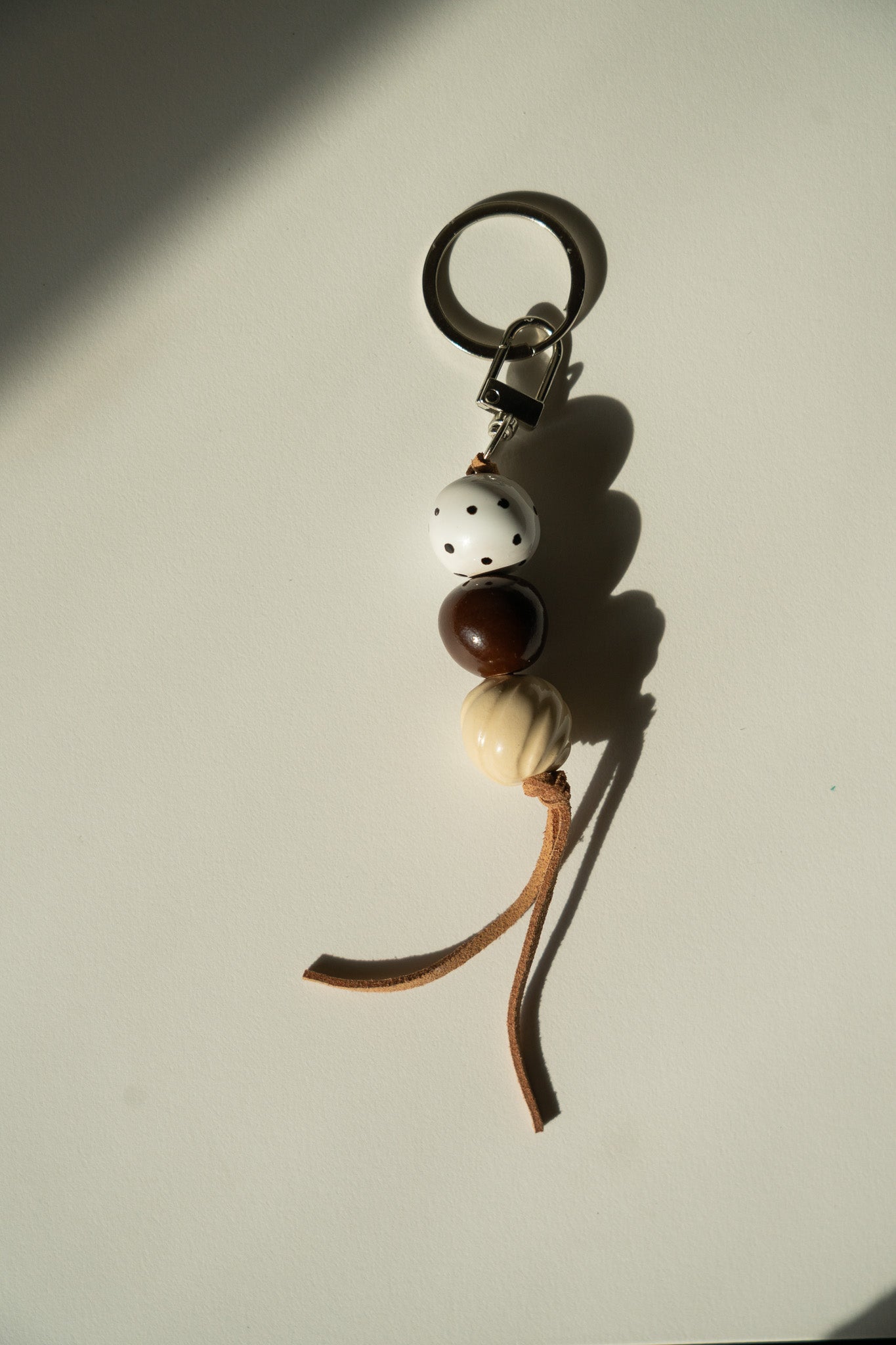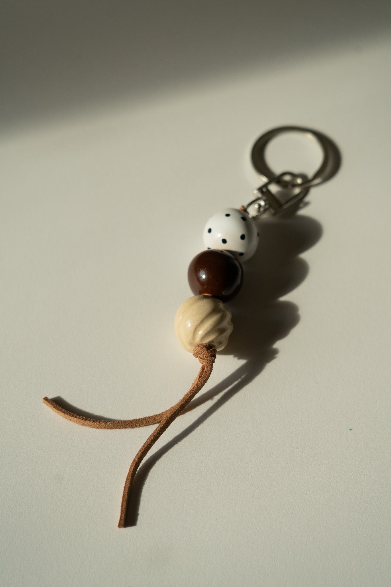This ceramic keychain is a small object with a lot of character. Three handmade ceramic beads in pastel and brown tones create a subtle, earthy rhythm that feels both tactile and timeless. The bottom bead is textured.