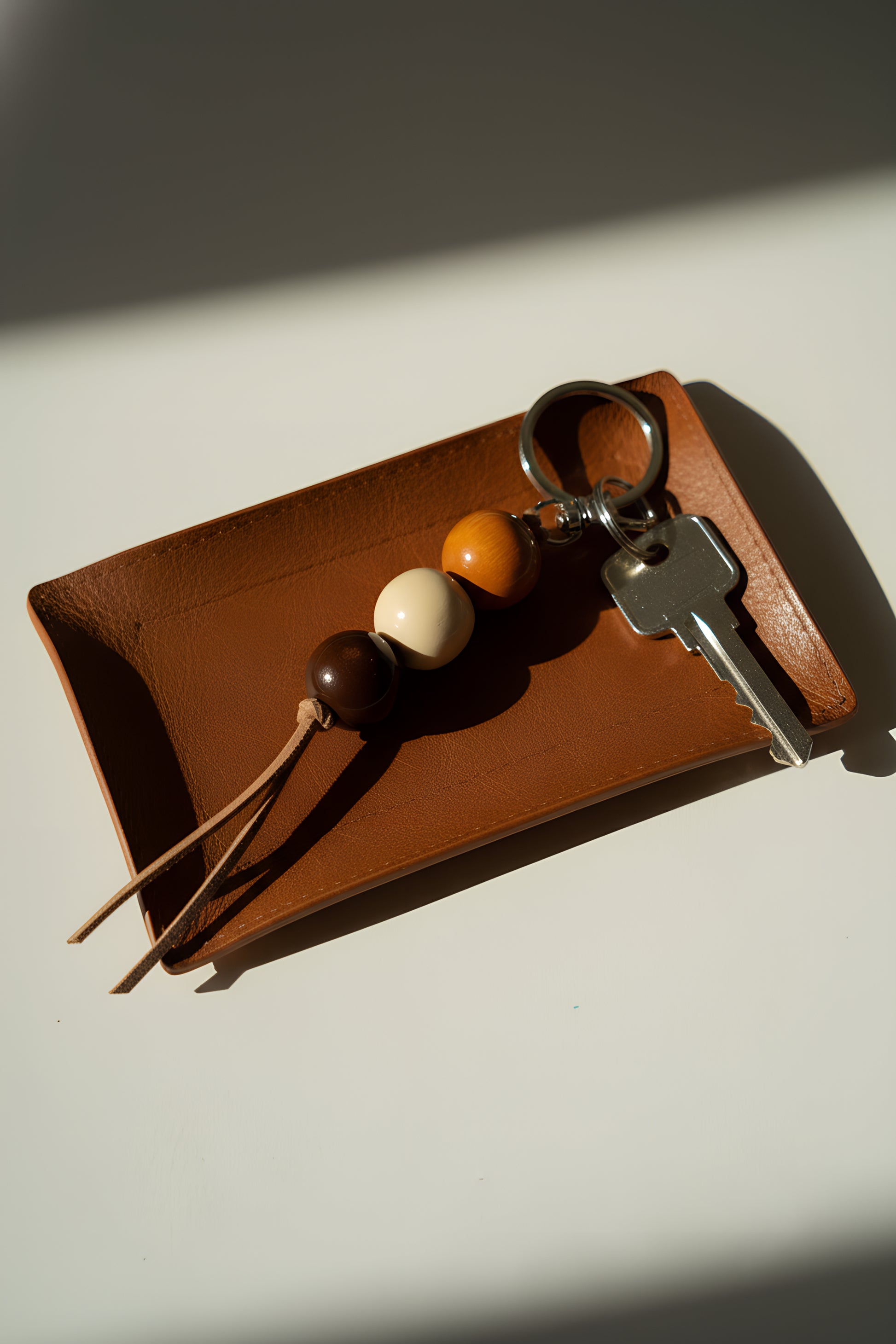 The beads are strung on a natural leather cord and finished with a silver-tone chain for durability and everyday use. Designed to be functional yet beautiful, this keychain adds a quiet accent to your keys, bag, or pouch.
