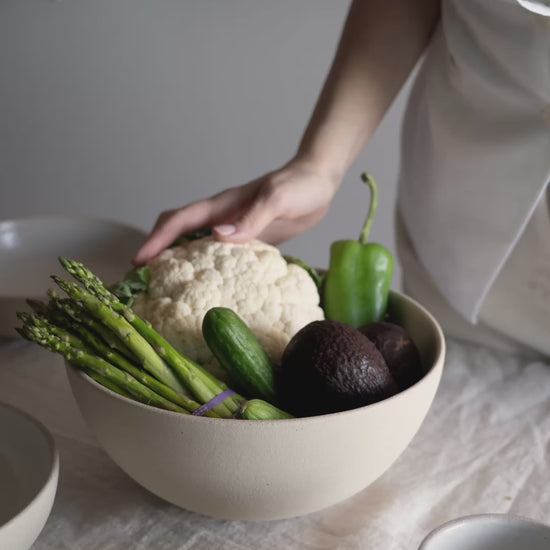 This is the most honest ceramic ware we have ever produced - exposed rough stoneware shows occasional signs of the artisans' fingers that were left during the hand-throwing process. The sides were smoothed but one can still see stoneware pores as if the dinnerware is breathing. The inside is covered with a transparent glaze for convenient use.