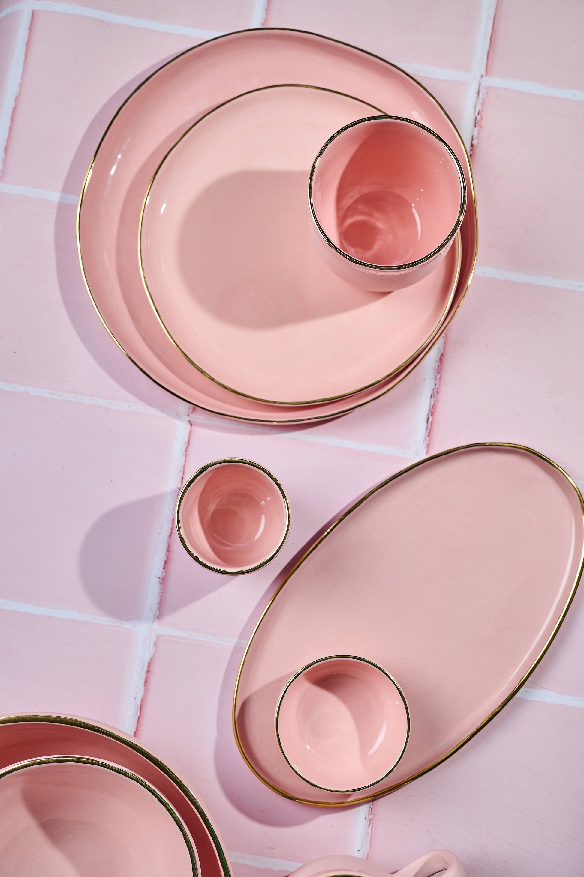 Handmade Porcelain Dinner Plates with Gold Rim. Powder Pink