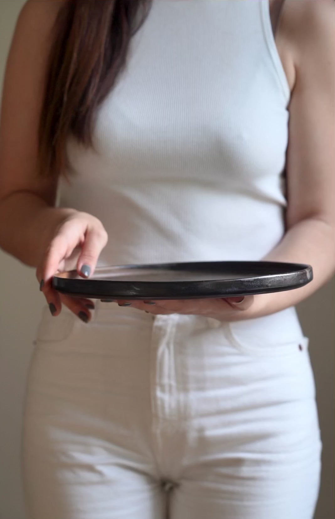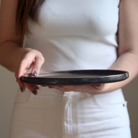 Matte brown-black dinner plates bring pottery vibes to mealtime. Hand-dipped in a reactive glaze that swirls uniquely across each piece. Low rim and simple style only add character to this dinnerware.