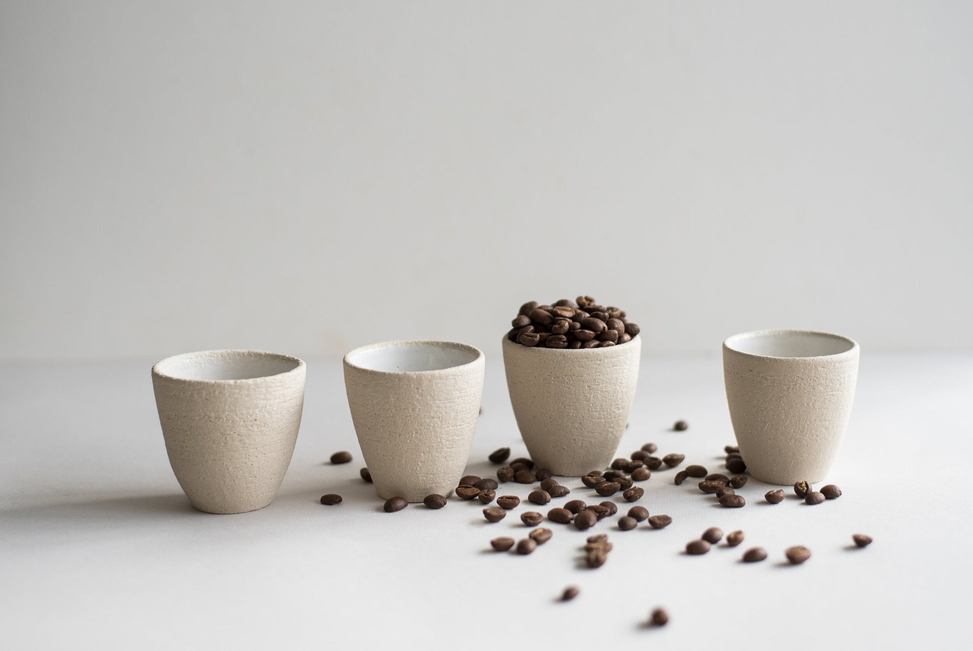 This tiny espresso cup with exposed clay from the outside and a white shiny glaze from the inside packs a petite punch as you caffeinate. Its shape and slightly rough texture bring fresh sophistication to the table.