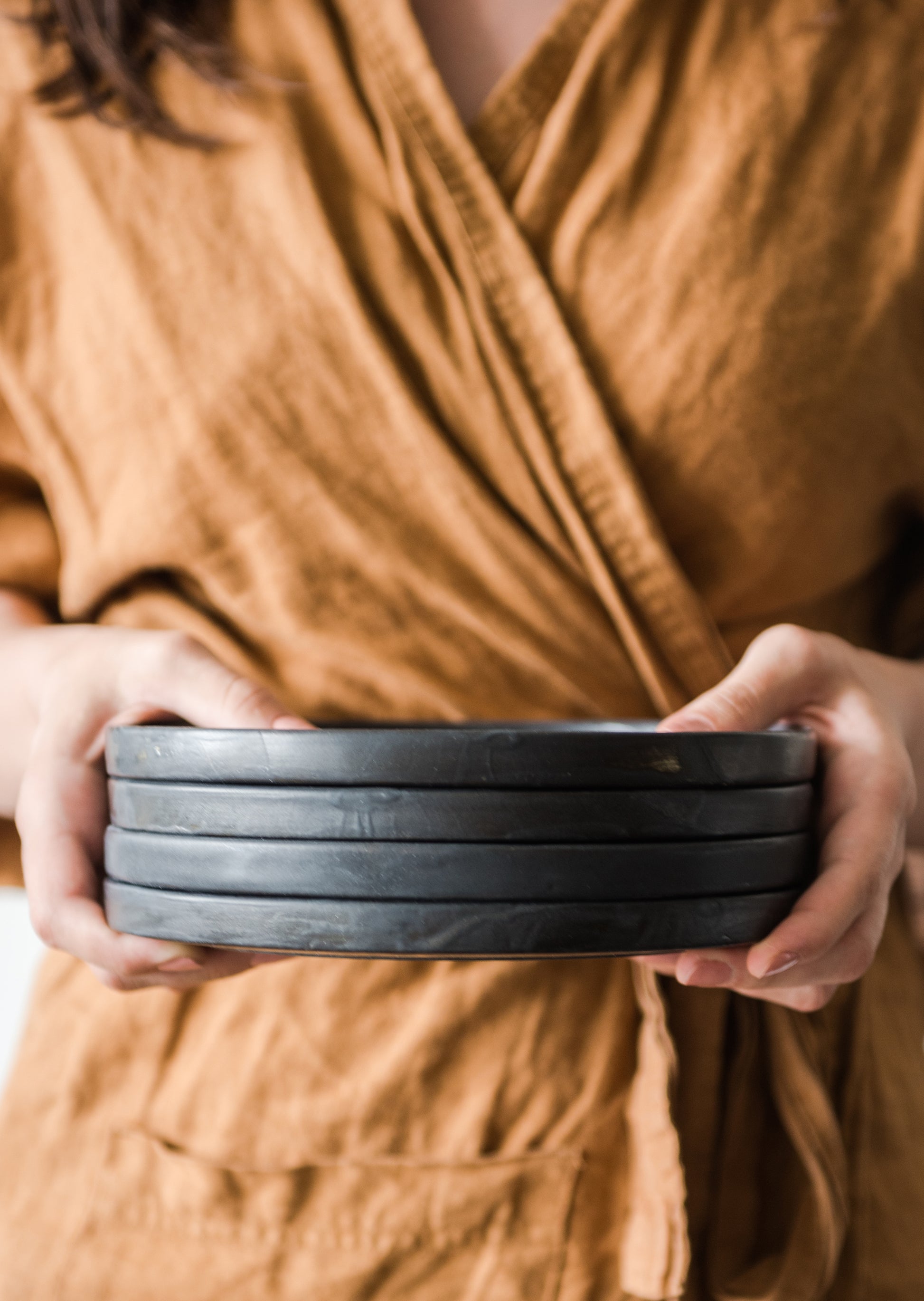 Handmade stoneware dinnerware covered in a modern matte black glaze sets the table for everyday and special occasions alike. Glazing process creates a light border ring around the pieces while organic sides keep things neatly inside. Such fine detailing adds texture and a hand-touched feel. Function and form are mixed in clean, streamlined shapes of durable stoneware.